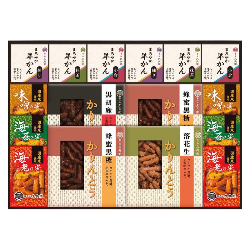 商品内容:蜂蜜黒糖かりんとう(40g)・あられ(海老・海苔・味噌)(12g)・羊かん(抹茶・練り・小倉)(60g)×各2、黒胡麻かりんとう(40g)・落花生かりんとう(40g)×各1