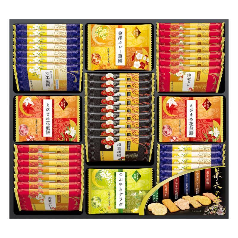 商品内容:黒ごま入り玄米煎餅・海老カレー煎餅×各14、えびまめ花煎餅×10、海老胡椒煎餅×9、金澤カレー煎餅・つぶやきサラダ煎餅×各5