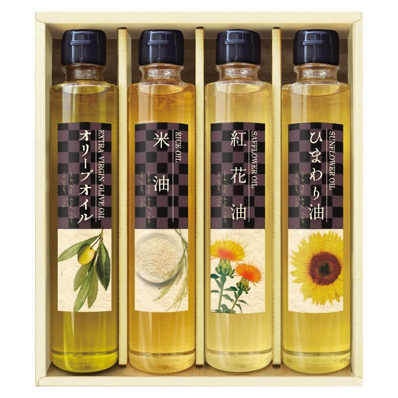 商品内容:エクストラバージンオリーブオイル(165g)・紅花油(165g)・米油(165g)・ひまわり油(165g)×各1