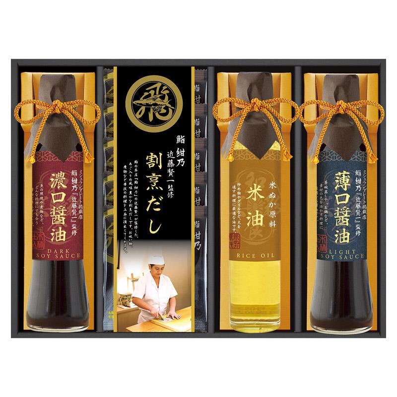 商品内容:鮨紺乃監修あご入り割烹だし(8g×5P)・鮨紺乃監修飛騨高山濃口醤油(200ml)・鮨紺乃監修飛騨高山薄口醤油(200ml)・米油(165g)×各1