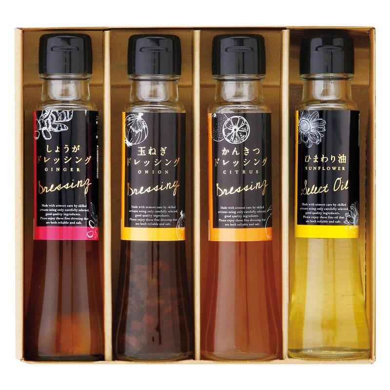 商品内容:しょうがドレッシング(100ml)・玉ねぎドレッシング(100ml)・かんきつドレッシング(100ml)・ひまわり油(90g)×各1