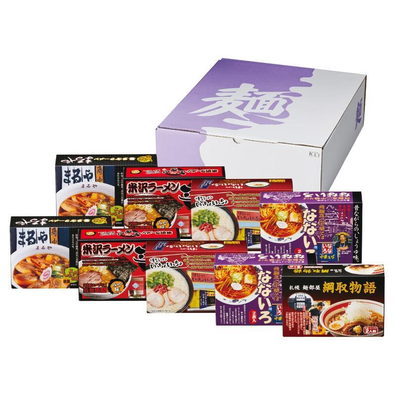 商品内容:喜多方ラーメン「まるや」醤油味(2食入)(220g)・米沢ラーメン「三男坊」味噌味(2食入)(268g)・博多ラーメン「いっちょいっちょ」豚骨味(2食入)(230g)・飛騨高山中華そば「なないろ」(2食入)(250g)×各2、北海道札幌ラーメン「綱取物語」味噌味(2食入)(288g)×1