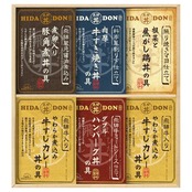 商品内容:飛騨牛仕込み牛すじカレー丼の具(180g)×2、照り焼きマヨ仕立て根菜と焦がし鶏丼の具(160g)・料亭風割り下仕立て牛すき焼き丼の具(170g)・飛騨牛ミートソース仕立てWハンバーグ丼の具(180g)・飛騨蔵元醤油煮込み豚角煮丼の具(170g)×各1