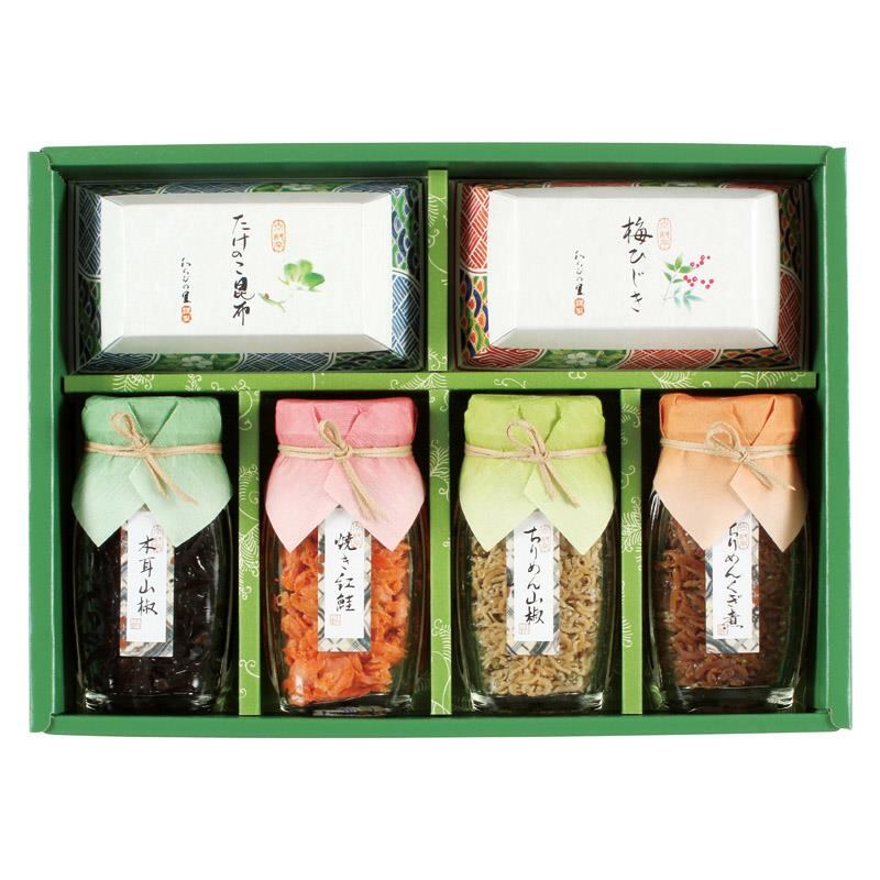 商品内容:ちりめん山椒(30g)・焼き紅鮭(43g)・ちりめんくぎ煮(45g)・木耳山椒(55g)・たけのこ昆布(50g)・梅ひじき(50g)×各1