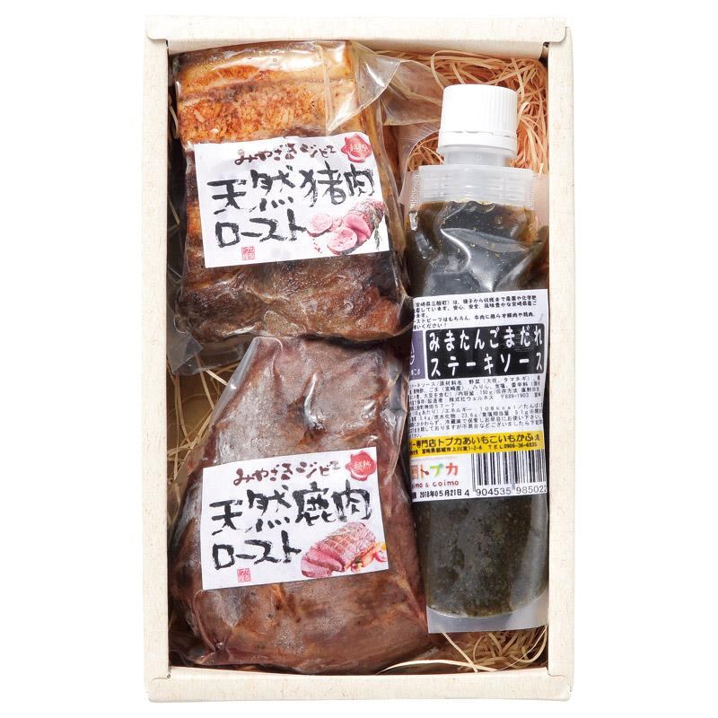 商品内容:天然鹿肉ロースト(200g)・天然猪肉ロースト(200g)・ゴマソース(150g)×各1