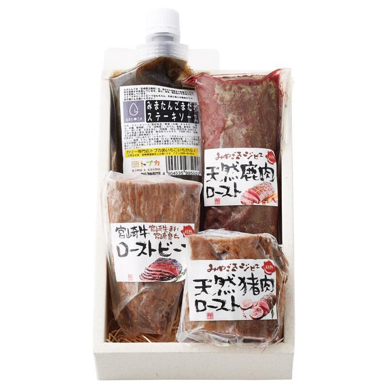 商品内容:天然鹿肉ロースト(200g)・天然猪肉ロースト(200g)・宮崎牛ローストビーフ(200g)・ゴマソース(150g)×各1