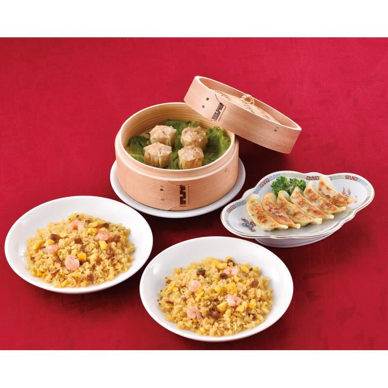 商品内容:餃子(6個入)(120g)・貝柱入焼売(4個入)(120g)×各1、ふっくら五目炒飯(200g)×2