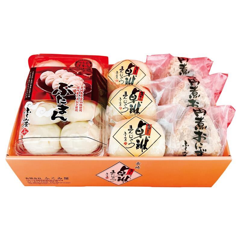 商品内容:長崎ぶたまん(26g)×8、角煮卓袱まんじゅう(60g)・角煮おにぎり(105g)×各3