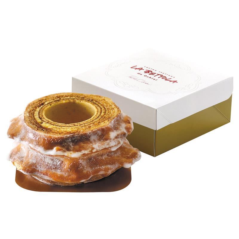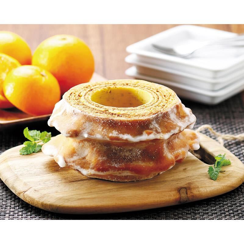 「ラ・ベットラ・ダ・オチアイ」落合シェフ監修の、オレンジピールを細かく刻んで生地に練り込み焼き上げたバウムクーヘンです。内側はしっとり、シュガーコーティングした外側はサクッとした食感です。