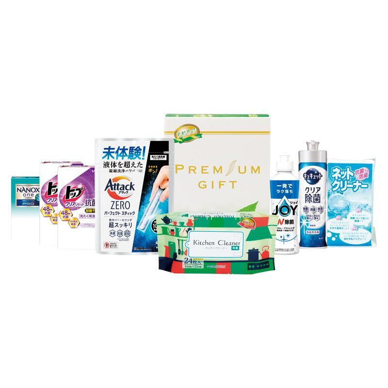 商品内容:花王アタックZEROパーフェクトスティック(7本入)・ライオンナノックスワンプロ(2P)・花王キュキュットクリア除菌(220ml)・P&G除菌ジョイコンパクト(170ml)・キッチンクリーナー(24枚)・ネットクリーナー(1P)×各1、ライオントップクリアリキッド抗菌(2P)×2