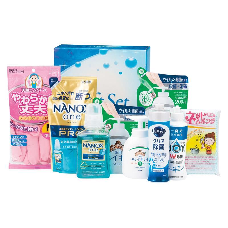 商品内容:ライオンナノックスワンプロ(380g)・ライオンナノックスワンプロ詰め替え(320g)・ライオンキレイキレイ薬用液体ハンドソープ(250ml)・花王キュキュットクリア除菌(220ml)・P&G除菌ジョイコンパクト(170ml)・ゴム手袋・ネットスポンジ(1P)×各1、ライオンキレイキレイ薬用液体ハンドソープ詰め替え(200ml)×2