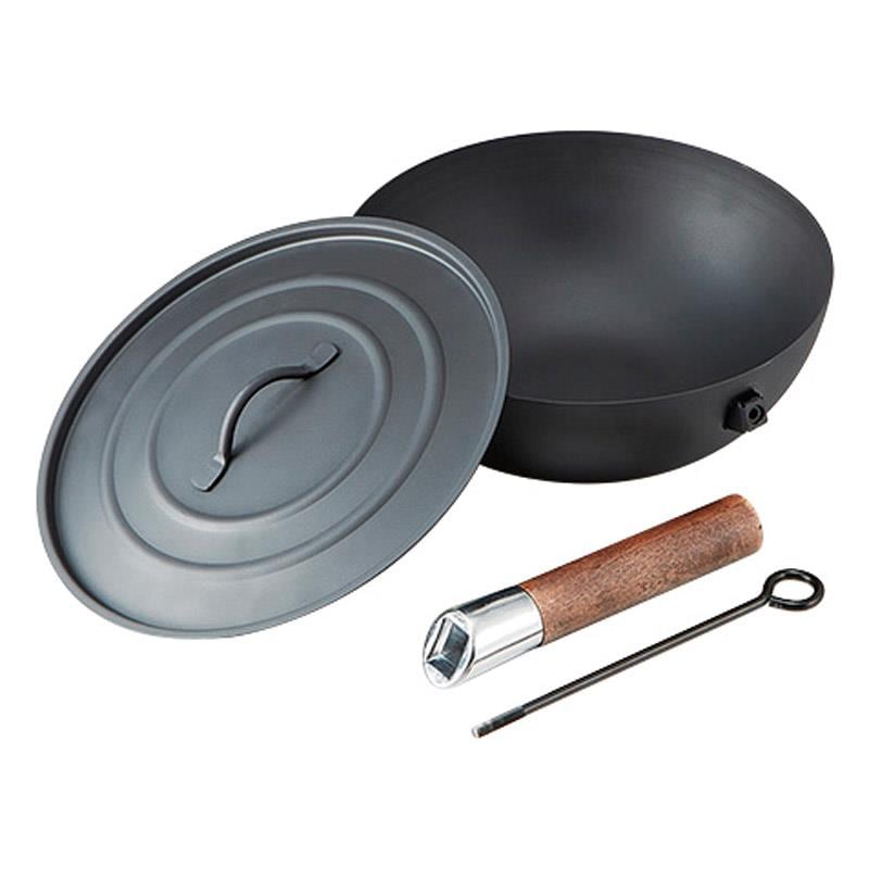 アウトドアにピッタリなコンパクトな中華鍋です。大きすぎず、重すぎず、携行性に優れた23㎝の中華鍋で機能は本格的。鍋の内側に目盛が付いています。炒める、焼く、煮る、蒸す、揚げる、炊く、燻製などの調理に対応できます。鉄製のフタで、フタが平なので上に炭を置いてダッチオーブン風の調理もできます。ハンドルは着脱可能なネジ式。収納袋付きでハンドルを外して入れられるのでコンパクトに持ち運びできます。