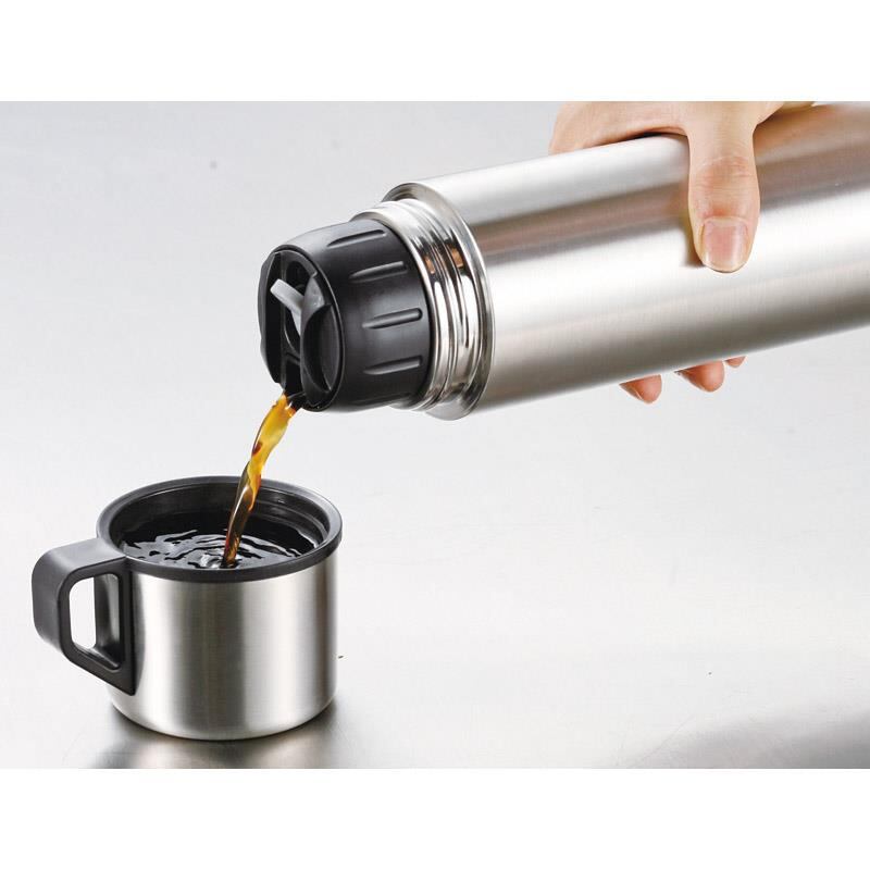 注ぎやすいワンタッチボタン。持ちやすいマグカップタイプの蓋付ステンレスボトルです。