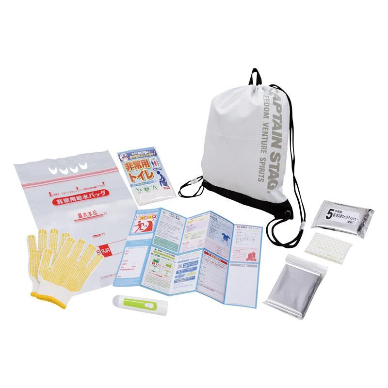 商品内容:ナップサック(約450×340mm)×1、非常用給水バッグ(3L)・ハンディライト・非常用トイレ・防寒シート・ポケットティッシュ(8W)・防災用ウエットティッシュ(20枚)・すべり止め手袋・防災ガイド×各1