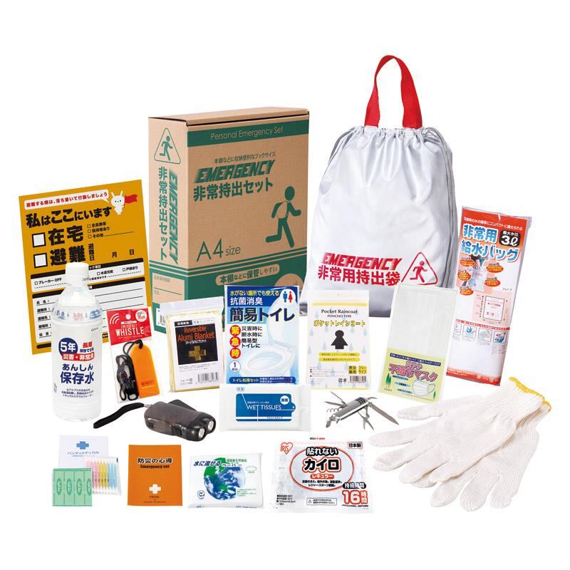 商品内容:非常持出袋(約335×390mm)×1、防災の心得・ホイッスル・カイロ・レインコート・抗菌消臭トイレ・ダイナモLEDライト・軍手・アルミブランケット・マスク・除菌アルコールウェットティッシュ・5年保存水(500ml)・8徳ナイフ・給水袋3L・緊急避難カード・水に流せるペーパー・綿棒&絆創膏×各1