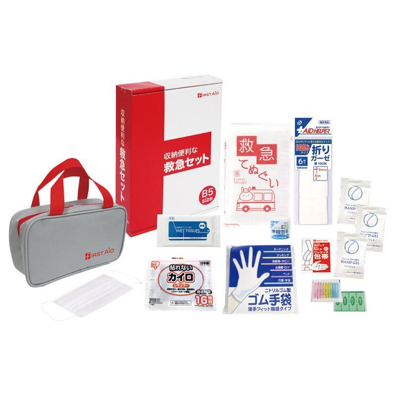 商品内容:収納ポーチ(約135×235×60mm)×1、抗菌伸縮包帯・カイロ・救急てぬぐい・折りガーゼ・除菌ウェットティッシュ・マスク・ワンタッチ包帯・綿棒(10P)・絆創膏(5P)・ゴム手袋×各1、ハンドジェル×3