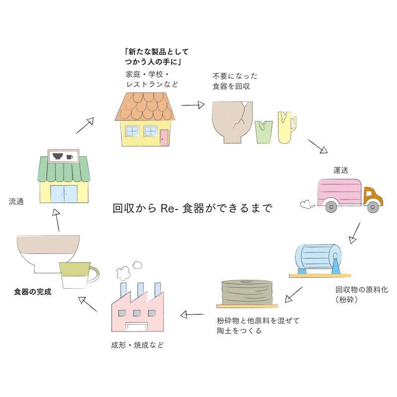 回収した不要食器を粉砕して、もう一度土に混ぜ込んで新しい姿に生まれ変わらせた食器を「Re-食器」といいます。食器をつかう人、つくる人、売る人、たくさんの人が手をつなぐことで、終わりのない資源循環の輪が生まれます。