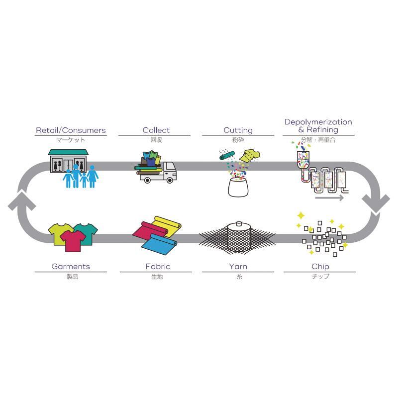 一般的なリサイクルポリエステルでは、選別された使用済みペットボトルを原料とし、溶かして再度糸にする手法を取ります。それに対してこのタオルに使用しているポリエステルは、使い終わった古着や工場での生産時に出た残反(生地)を原料としています。分解・再重合などといった工程を経ることで石油由来のポリエステルと比較してもクオリティが劣らないポリエステルを生産することができます。