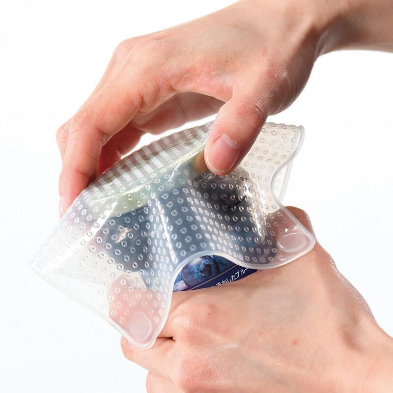 保存・レンジで温める際のフタ・滑り止め・キャップオープナーなど様々な使い方ができるシリコーンラップ。