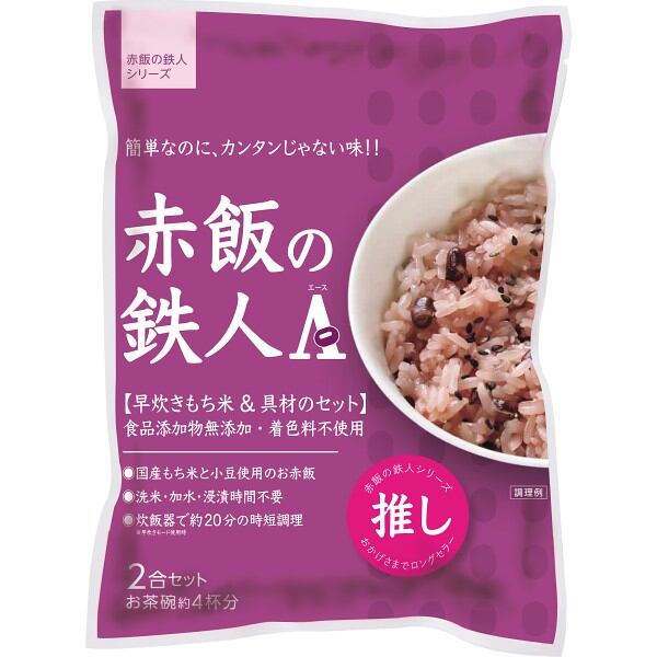 国産もち米と具材(赤飯のスープと小豆)がセット。洗米不要・水入らず、浸漬時間不要、中身を炊飯器に入れて約20分の時短調理。「簡単だけど、カンタンじゃない味」。下ごしらえ要らずで「炊きたて、ほかほか」のお赤飯をお楽しみください。