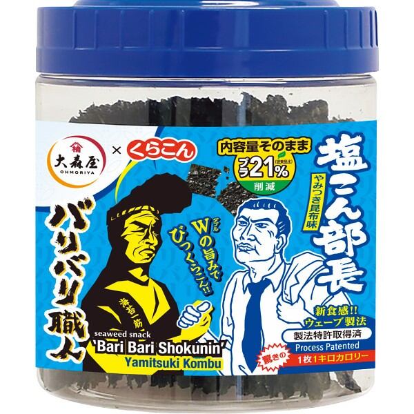 独自製法で新食感を実現しました。おやつ感覚の味付のりで、そのままバリバリお召し上がりください。くらこん「塩こん部長」とのコラボで海苔と昆布のWの旨味を実現しました。