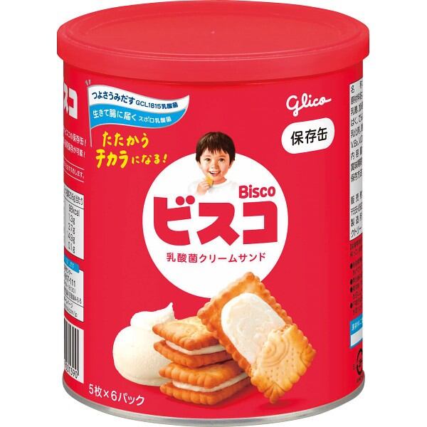 昭和8年より発売している「ビスコ坊や」でおなじみの「ビスコ」の保存食・クリームサンドビスケットなので、小さなお子様からお年寄りの方まで食べやすく、幅広い年齢の方にお勧めです。5枚ずつ分包したものが6袋入っているので、みんなで分けやすくなっています。エージレス入りで、製造後5年間の長期保存が可能です。