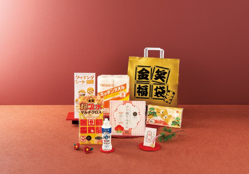 黄金に輝く福袋に日用品をぎゅっと詰めました。