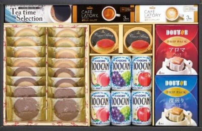 ドトールドリップパック(アロマブレンド・深煎りブレンド)各7g×各4P、カフェラトリー(濃厚ミルク10.5g・濃厚ビター9g)×各3P、チョコクッキー×4、モザイククッキー(バニラ&イチゴ・バニラ&抹茶・チョコ&ブルーベリー)×4、カスタードプリン75g×2、カゴメ100CAN(アップル・グレープ・ピーチブレンド)各160g×各2