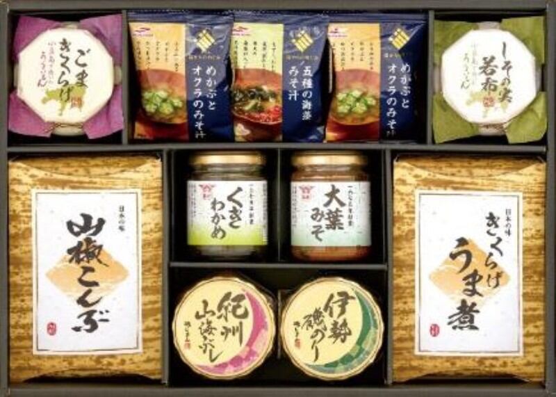 酒悦(大葉みそ115g・くきわかめ80g)、磯じまん(伊勢磯のり・紀州山海ぶし)各125g、マルハニチロ(めかぶとオクラのみそ汁×2・五種の海藻みそ汁)、山椒こんぶ80g、きくらげうま煮80g、しその実若布50g、ごまきくらげ55g