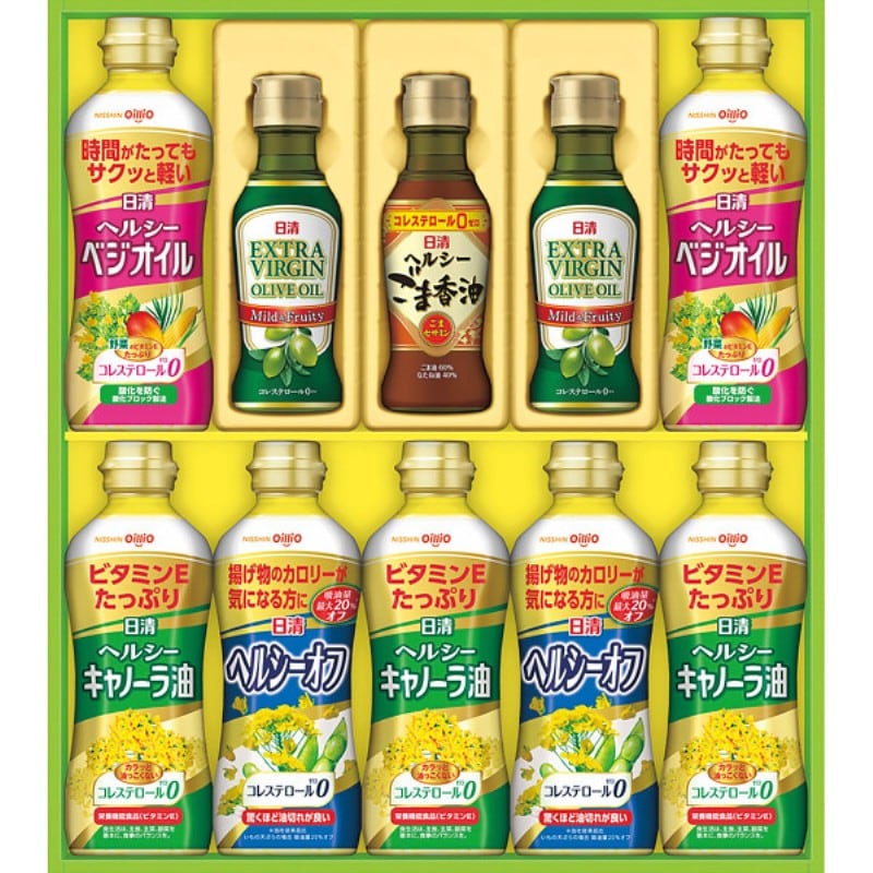 商品内容:●ヘルシーキャノーラ油350g×3、ヘルシーベジオイル350g×2、ヘルシーオフ350g×2、エキストラバージンオリーブオイル145g×2、ヘルシーごま香油145g×1