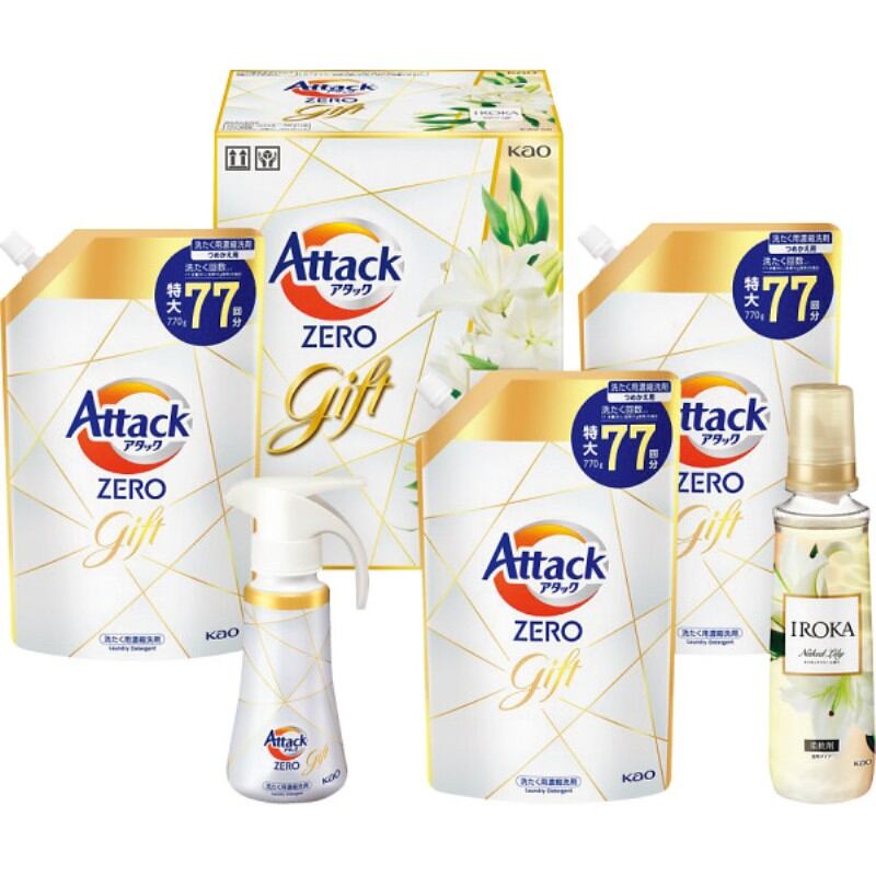 商品内容:●アタックZEROワンハンド本体(380g)×1、アタックZERO詰替用(770g)×3、IROKA柔軟剤ネイキッドリリーの香り本体(570ml)×1