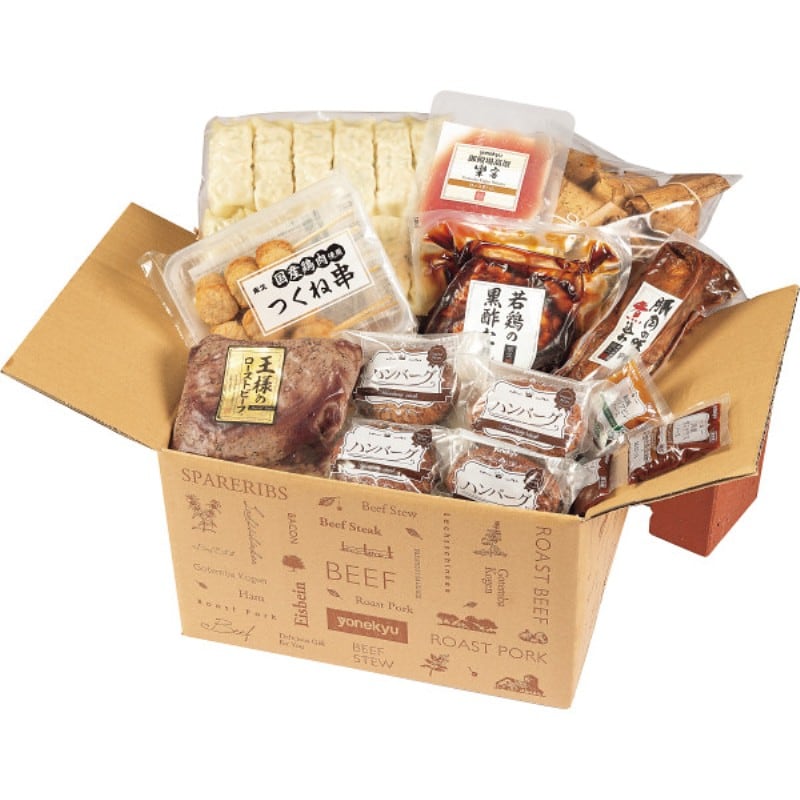 商品内容:●王様のローストビーフ450g×1、ハンバーグ(牛肉・豚肉使用)130g×4、洋風デミグラスソース40g×2、和風シャリアピンソース40g×2、豚肉の味噌煮込み450g×1、若鶏の黒酢たれ300g×1、つくね串210g(6本)×1、ロース生ハム67g×1、瀬戸内六穀豚使用棒餃子480g(12本)×1、中華ちまき700g×1