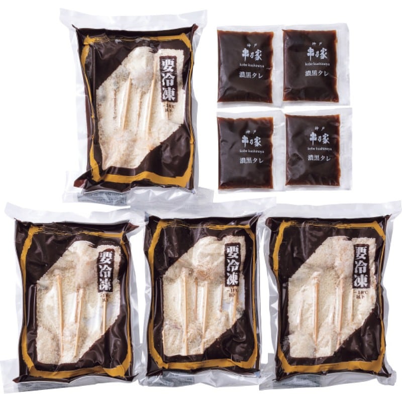 商品内容:●串揚げ8種(海老・きす・鶏つくね・ポークロール・ミートローフ・蓮根・鳴門金時・鶏ささみ)×4パック(計32串)、ソース30g×4