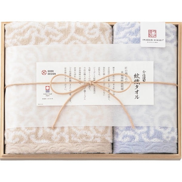 「今治謹製 紋織タオル」は木目も美しい木箱入りタオルです。箱を手に取った瞬間の木の温もりは感謝の気持ちをお伝えするタオルギフトに花を添えます。