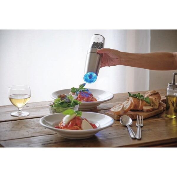 操作は簡単傾けるだけで、センサーが反応し自動で挽ける電動スパイスミル。サッと使えるため調理や食事中にも使いやすい。