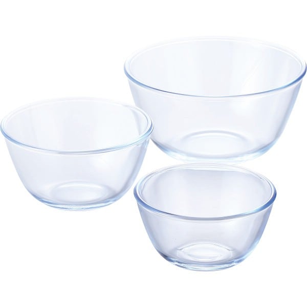 商品内容:●ボウル500ml(約12.8φ×7cm・500ml)・ボウル800ml(約15φ×8.1cm・800ml)・1.5l(約19φ×9.5cm・1.5l)×各1●オーブンレンジ可・電子レンジ可