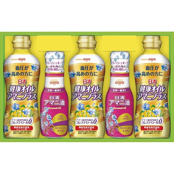 日清アマニ油と加熱料理にも使える健康オイルアマニプラスを詰め合わせたギフトセットです。