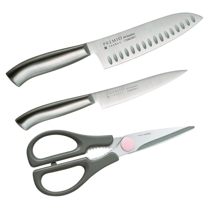 機能的な三徳包丁と果物のカットに使い易いペティナイフと便利なキッチンバサミのセットです。