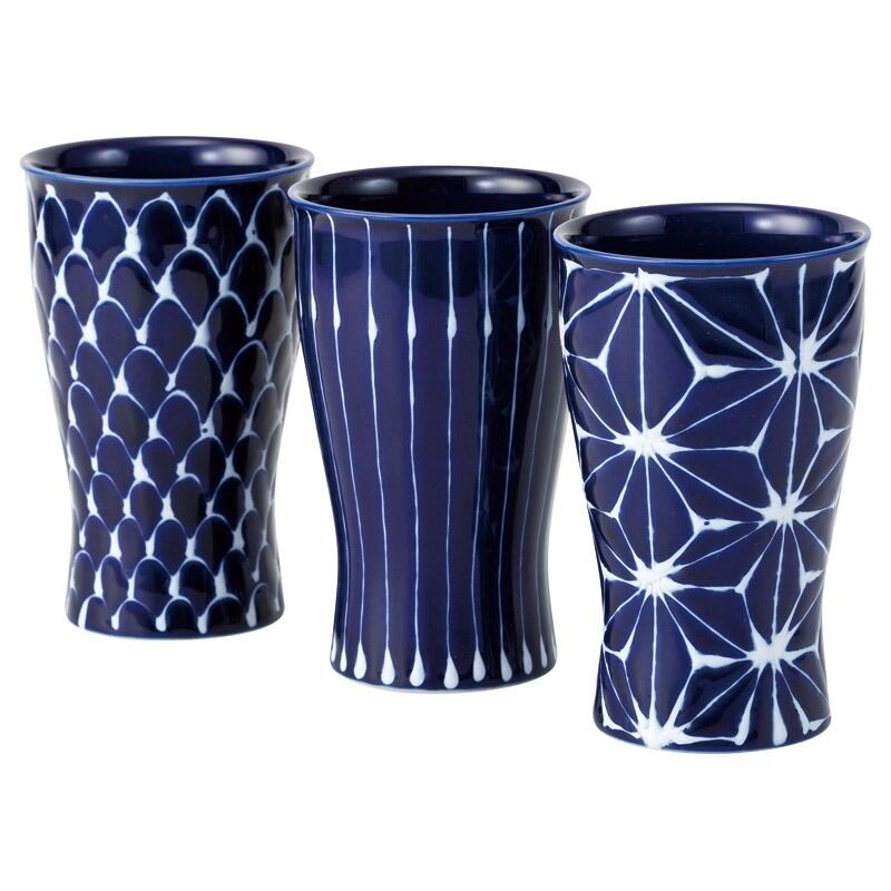 切子グラスを想像させる綺麗な瑠璃色のフリーカップセット。持ち易く、お茶やお酒類などを楽しむのに最適な形状とサイズ感です。