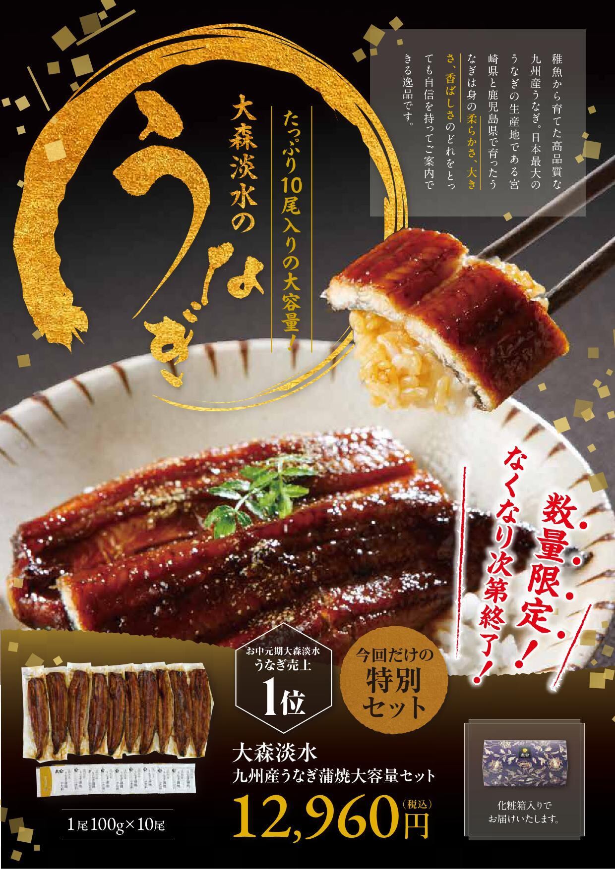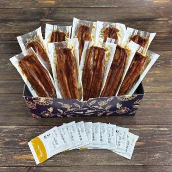 商品内容:●九州産うなぎ蒲焼 大容量セット 1尾100g×10尾:真空個包装)、●山椒付タレ×10