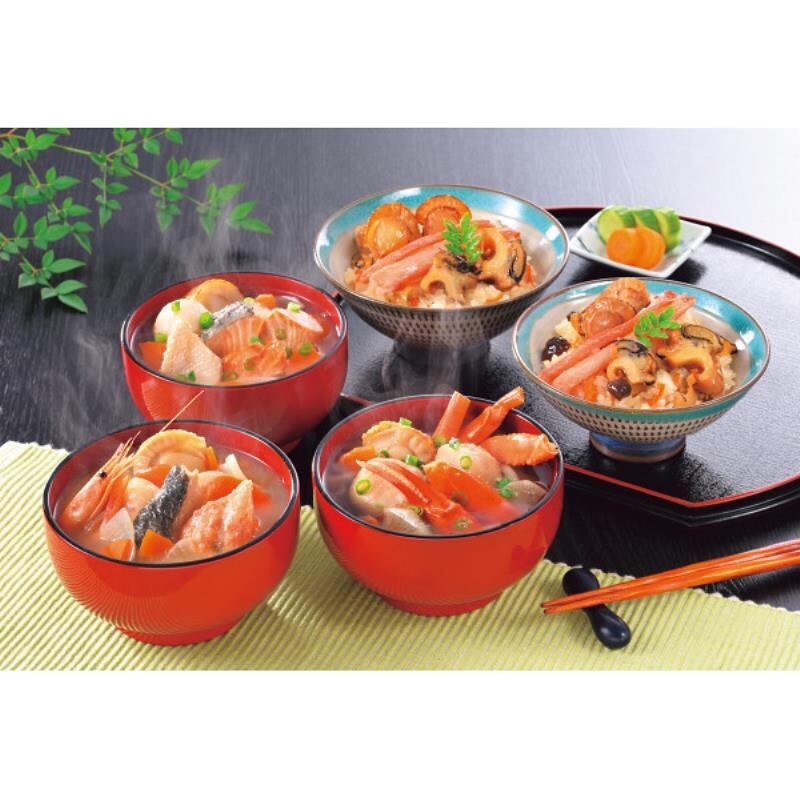 商品内容:●海鮮おこわ170g×2、石狩鍋280g・かに鍋280g・鮭うしお汁280g×各1(北海道小樽製造)