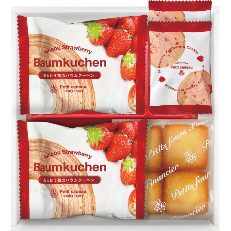 商品内容:●あまおう苺バウムクーヘン×2、プチフィナンシェ4個入(プレーン)×1、焼きほろろクッキー(イチゴ)×2