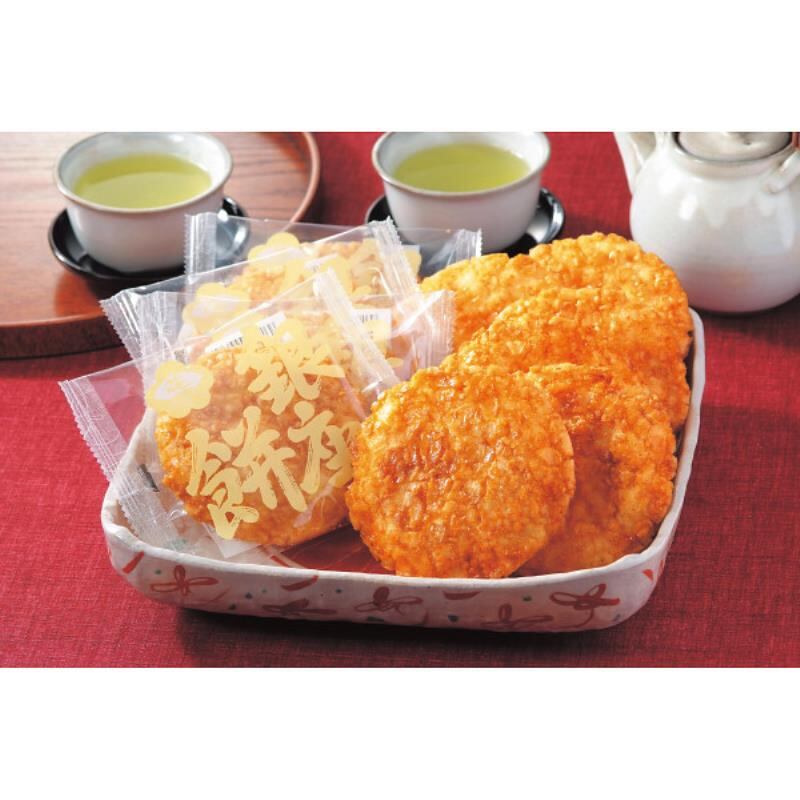 直径約10cmもある国産のうるち米を使用したカラッと揚げたおせんべいを特製醤油タレで仕上げました。上品な味わいでサクッとした口あたりが人気です。