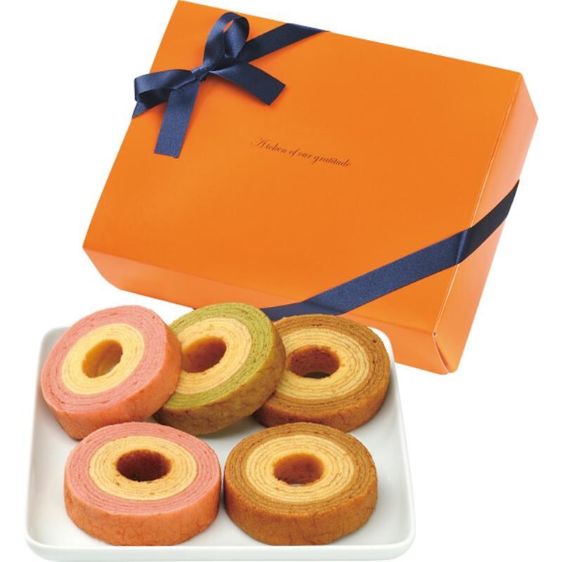 商品内容:●2層バウムクーヘン(キャラメル&ミルク・ストロベリー&ミルク×各2、抹茶&ミルク×1)