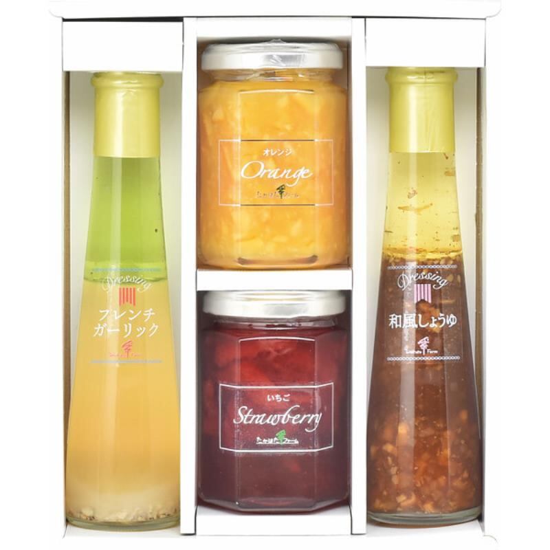 商品内容:●ジャム145g×2(オレンジマーマレード、いちご)、ドレッシング122ml×2(フレンチガーリック、和風しょうゆ)