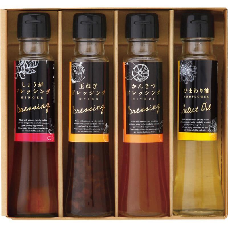 商品内容:●しょうがドレッシング・玉ねぎドレッシング・かんきつドレッシング各100ml×各1、ひまわり油90g×1
