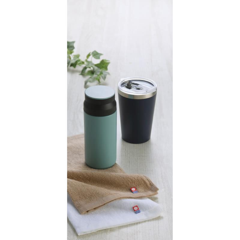 サーモボトルと今治タオルのセットです。ボトルは真空二重構造となっており飲み頃温度をキープします。