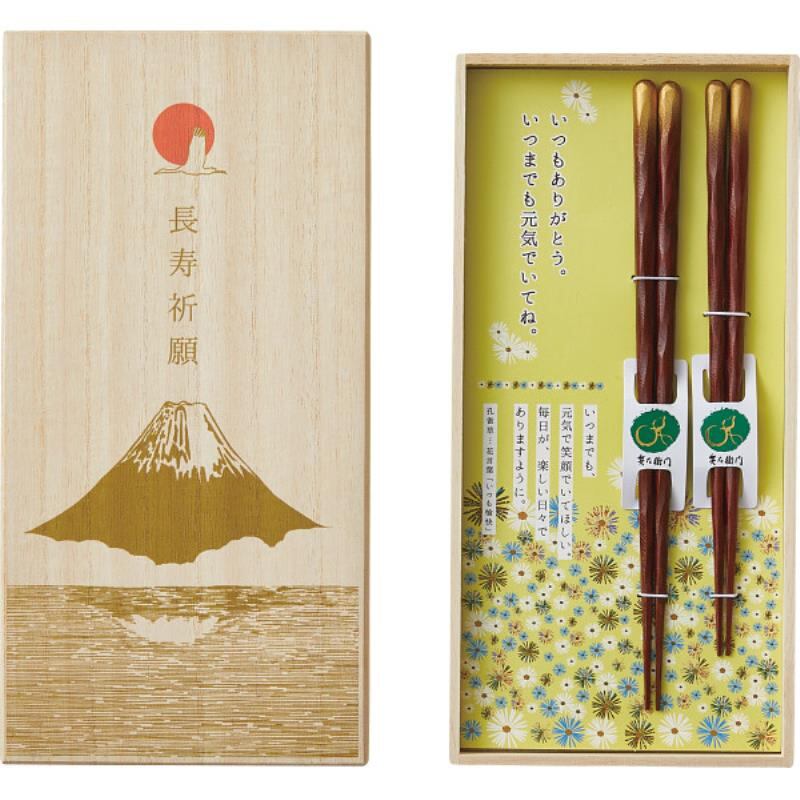 お箸は、究極の使いやすさと持ちやすさを追求した兵左衛門の代表作『けずり箸』の形状で、持ってみるとしっくりと手に馴染み、まるで指先でつまんでいるような使い心地のお箸です。箸頭を金色で装飾し、ひかえめながら華やかさも加え、長寿を祝うのに相応しいデザインに仕上げています。末広がりで縁起の良い富士山柄に長寿祈願の文字を配した桐箱入り。