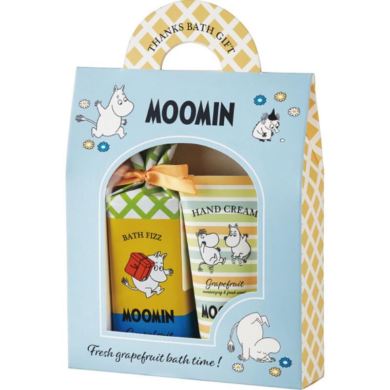 発泡タイプの入浴料とシアバター、ホホバオイル配合のハンドクリームのセット。ムーミン谷の仲間とリラックスタイムをお届けします。グレープフルーツの香り