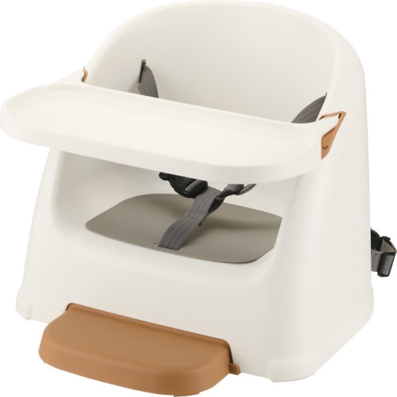 背もたれ、ステップ、座面シートで姿勢をサポートするブースターチェアです。ステップは、足がブラつかず両足がきちんとつくので、落ちついて食事に集中できます。ステップが不要になったら本体下に収納できます。座面シートでズリ落ちを防止し、安定して座ることができます。フラット座面・ポリエステル製の股ベルトなので、足まわりも窮屈感なく座れます。テーブルはロックレバーを押すだけで、簡単に取り外せます。